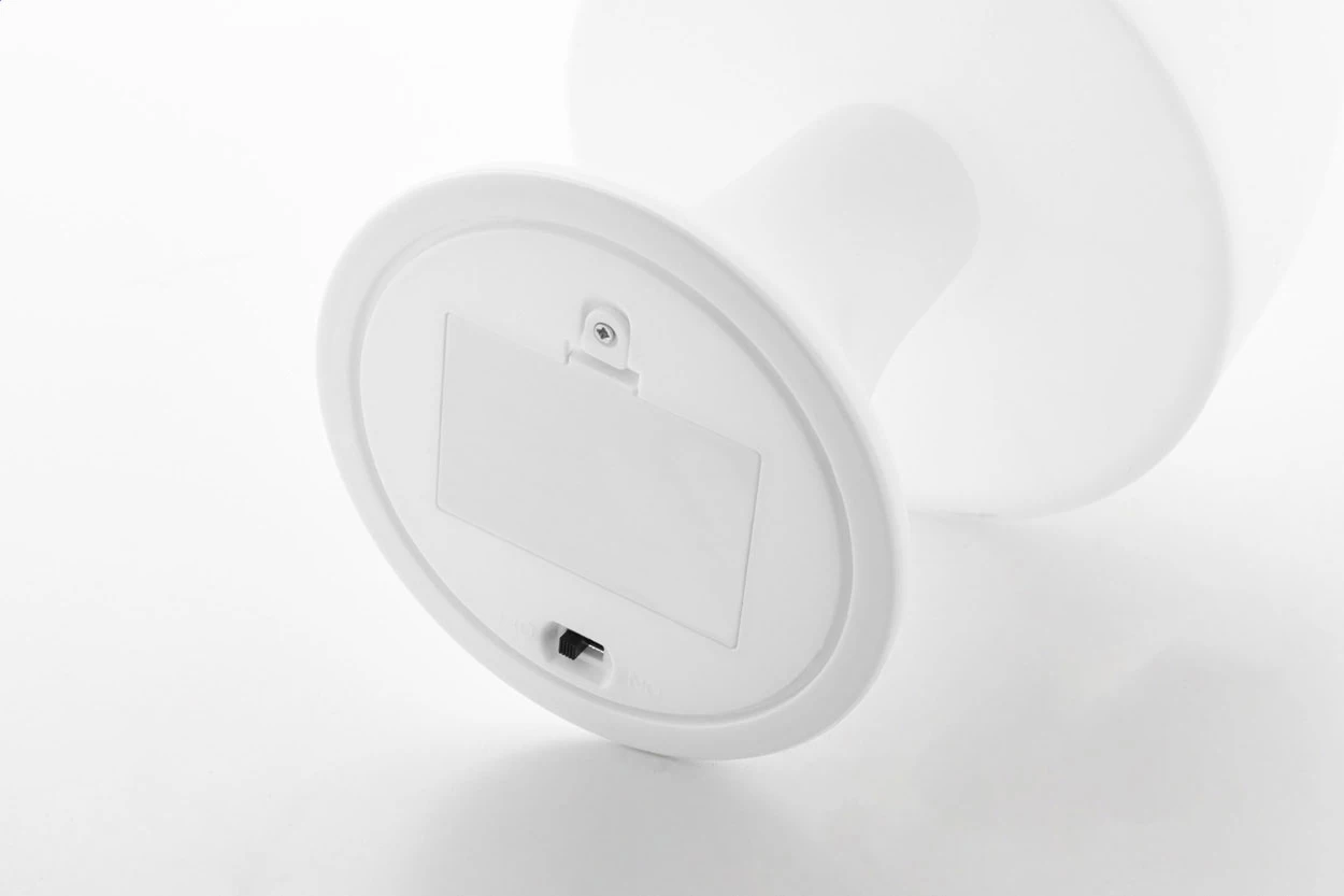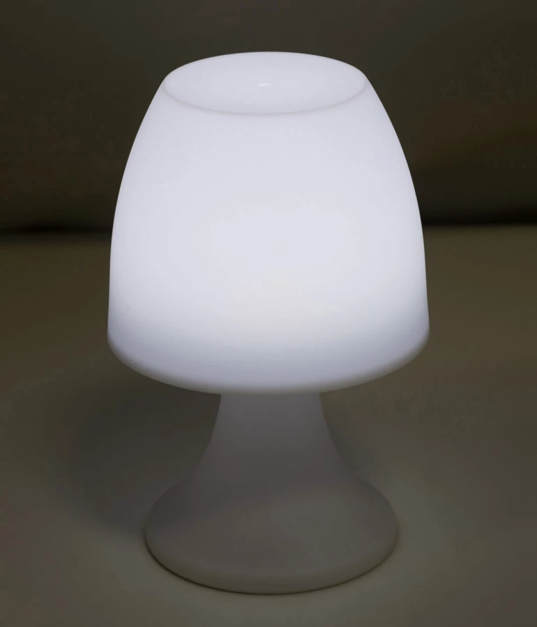 Plastikowa lampa stołowa z białym światłem LED. Działa na 3 baterie AAA, bez baterii.