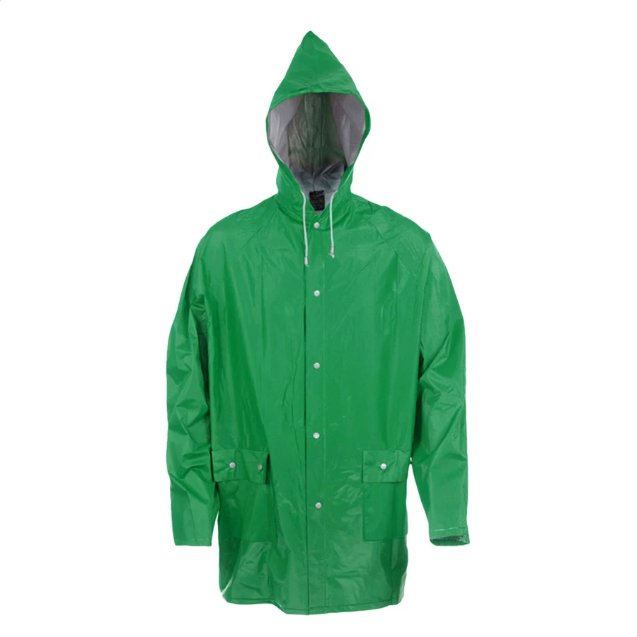 Płaszcz przeciwdeszczowy z kapturem z odpornego PVC z wykończeniem zgrzewanym na gorąco. Zapinany na guziki z 2 dwiema kieszeniami z przodu.