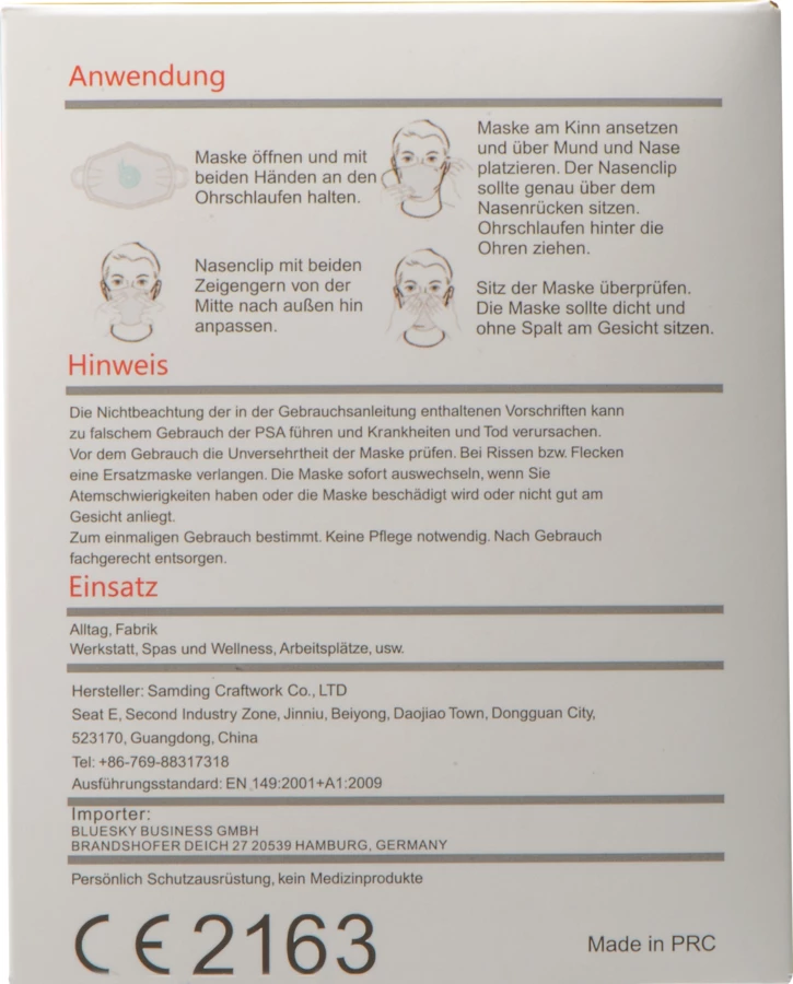 Maska ochronna 5-warstwowa, posiada dwie gumowe pętle na uszy i zintegrowany klips na nos, który pozwala lepiej dopasować ją do kształtu twarzy. Wykonana z włókniny, polaru „meltblown” oraz bawełny. Maska FFP2 zgodna z normą EN149:2001 + A1:2009.