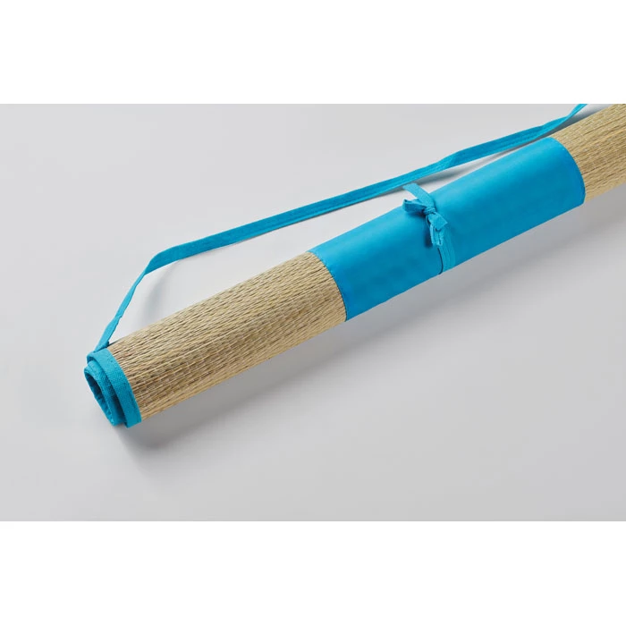 Zwijana mata plażowa z naturalnej słomy z poliestrowym paskiem do przenoszenia.