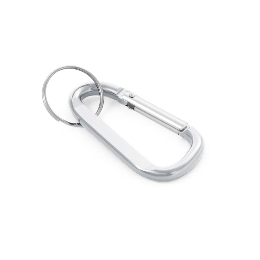 Aluminiowy karabińczyk, z brelokiem i płaską powierzchnią do personalizacji. Nie nadaje się do wspinaczki. Pierścień: ø 25 mm | Produkt: 60 x 32 x 5 mm | Razem: 80 x 32 x 5 mm