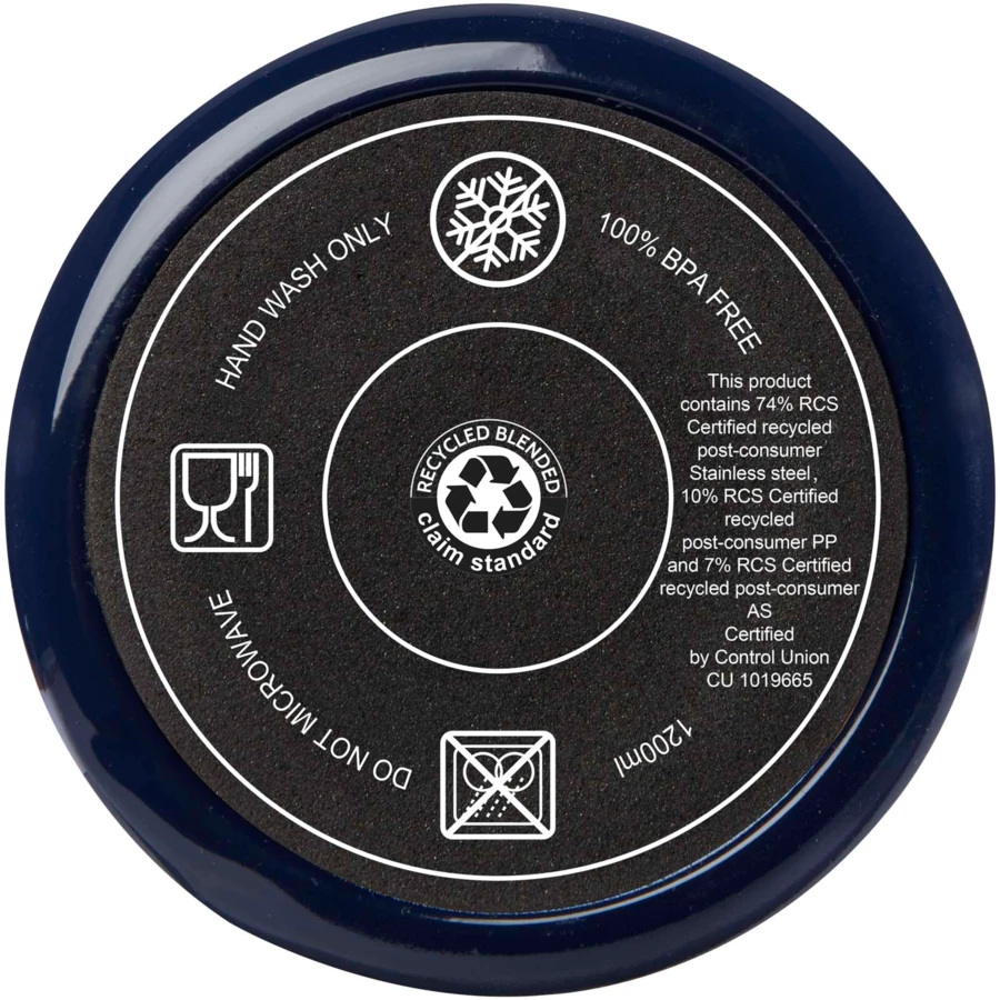 Melbourne kubek o trwałej konstrukcji z podwójnymi ściankami, dzięki czemu utrzymuje wysoką lub niską temperaturę napojów w każdym otoczeniu. Wewnętrzna ścianka kubka wykonana jest z tworzyw sztucznych pochodzących z recyklingu, a zewnętrzna ze stali nierdzewnej z certyfikatem RCS. Kubek ma pojemność 1200 ml, dzięki czemu zapewni Ci nawodnienie przez cały dzień w dobrym stylu. Posiada odporną na rozchlapywanie, wciskaną pokrywę z dwoma otworami i obrotowym zamknięciem. W zestawie słomka z recyklingu przeznaczona do kontaktu z żywnością. Tylko do mycia ręcznego.