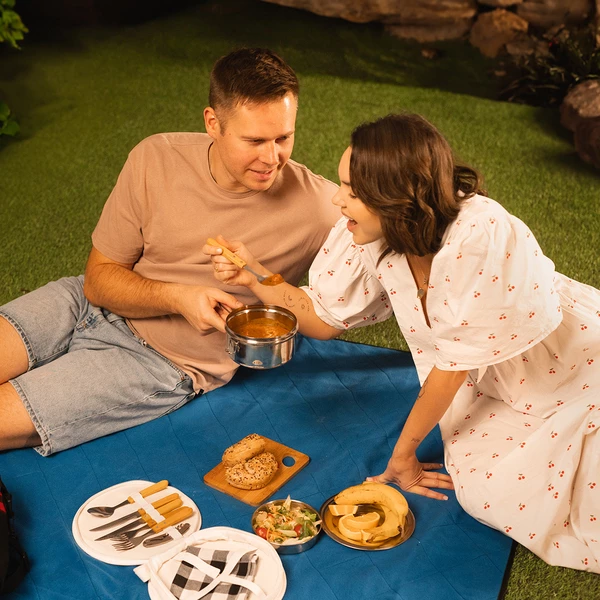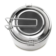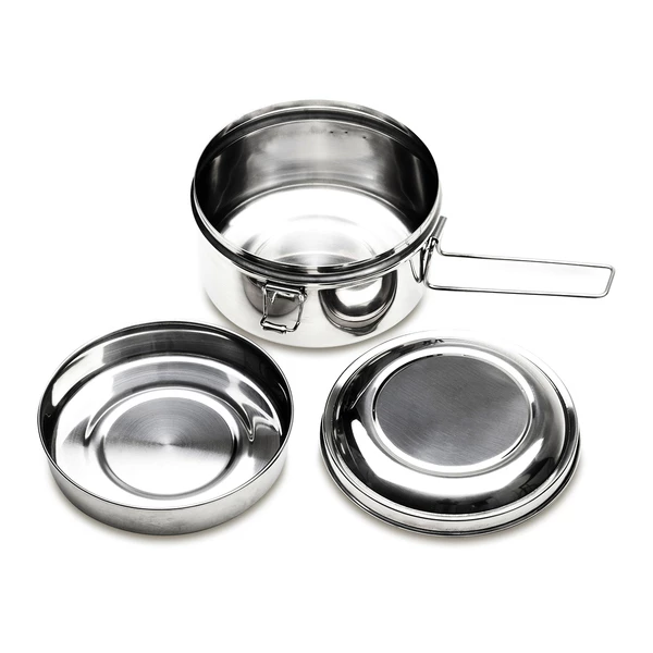 3-elementowy zestaw turystyczny ze stali nierdzewnej. W jego skład wchodzą: naczynie/garnek o pojemności 1l, mniejsze naczynie o pojemności 350 ml i pokrywka. Całość zamykana na klamry boczne. To idealny zestaw na biwak, kemping i plenerowe aktywności.