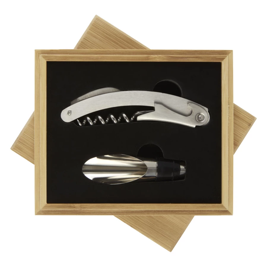 2-częściowy zestaw do wina składający się z korkociągu kelnerskiego i nalewaka do butelek. Dostarczane w bambusowym pudełku upominkowym, które zostało wyprodukowane zgodnie z zasadami zrównoważonego rozwoju.