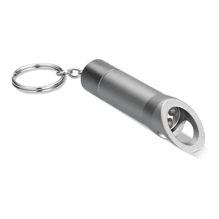 Metalowa latarka Led zawieszona na breloczku, zawierająca otwieracz do butelek.