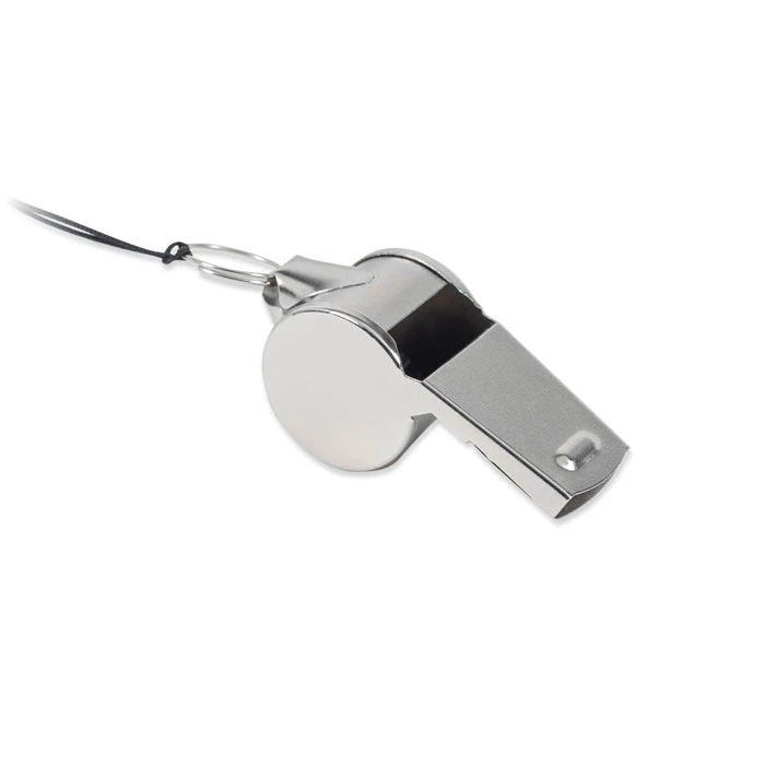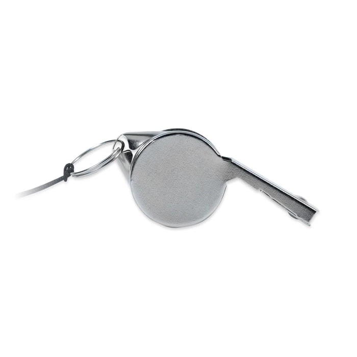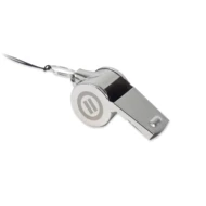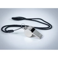 Metalowy gwizdek przymocowany do smyczy z klamrą bezpieczeństwa.