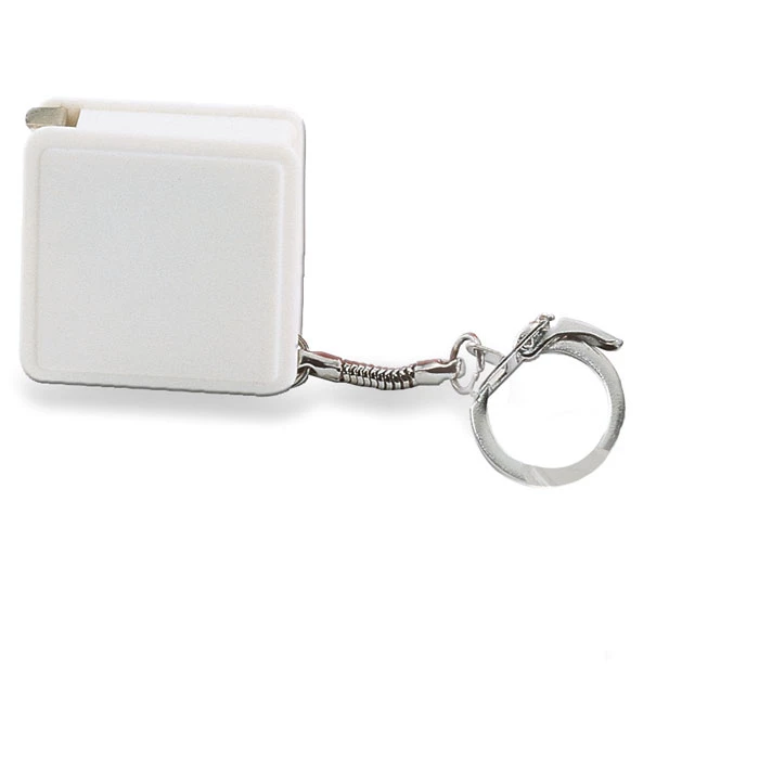 Kwadratowa stalowa miarka z brelokiem. Długość: 1 metr. Plastikowa obudowa.
