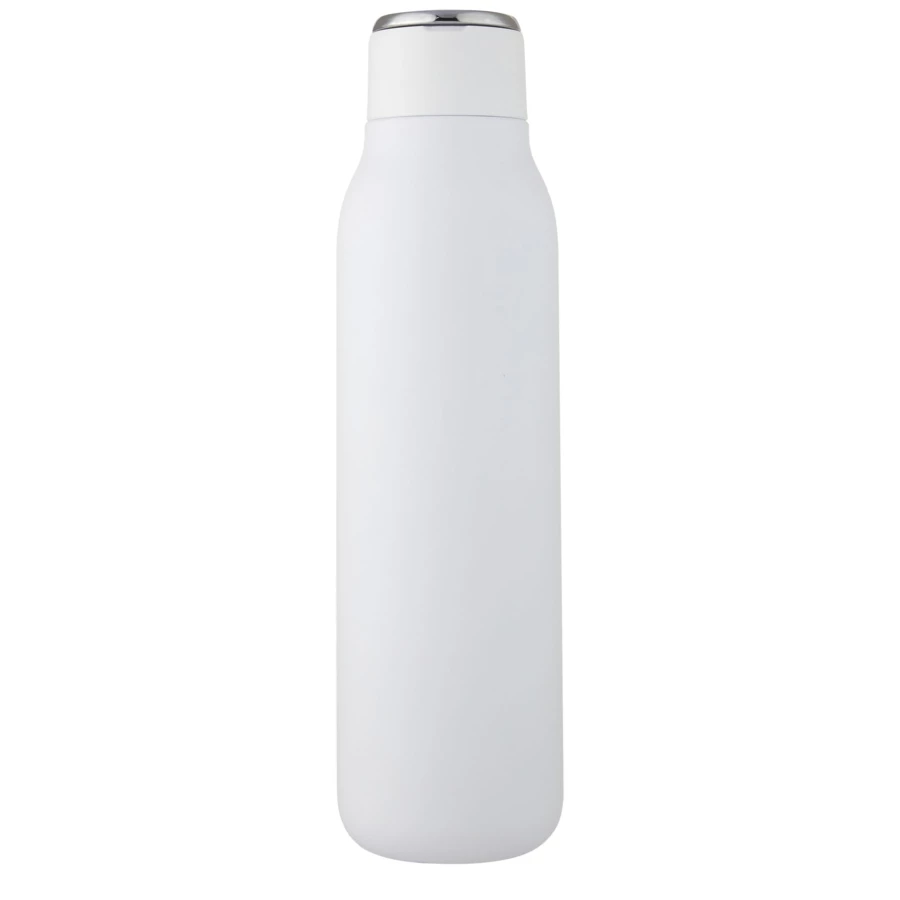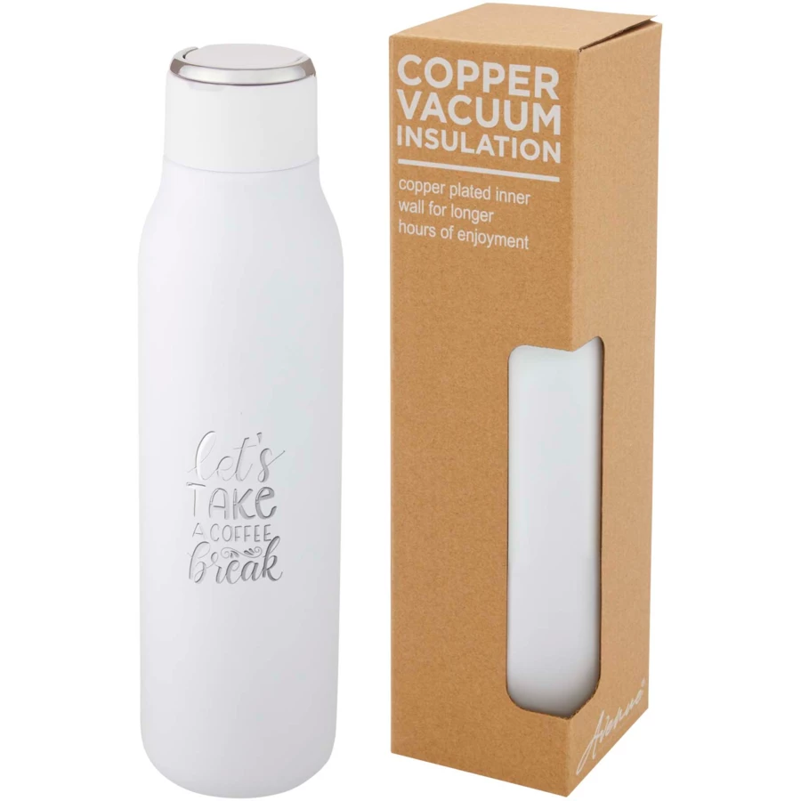 Butelka Marka posiada konstrukcję próżniową ze stali nierdzewnej z miedzianą izolacją, która utrzymuje ciepło lub zimno napojów przez kilka godzin. Izolowana konstrukcja ze stali nierdzewnej 18/8 zapobiega skraplaniu się wody na zewnątrz butelki, a modne wykończenie z lakieru proszkowego sprawia, że jest ona wyjątkowo trwała. Butelka posiada również zakręcaną, odporną na rozlanie pokrywkę oraz trwałą, wykonaną ze stopu cynku pętelkę na rękę. Wolna od BPA, przetestowana i zatwierdzona zgodnie z niemiecką ustawą o bezpieczeństwie żywności (LFGB). Sprawdzona i zatwierdzona pod kątem zawartości ftalanów zgodnie z przepisami REACH. Pasuje do większości standardowych uchwytów samochodowych. Pojemność 600 ml. Zaleca się mycie ręczne. Zapakowany w kartonowe pudełko upominkowe wykonane z materiałów pochodzących z recyklingu.