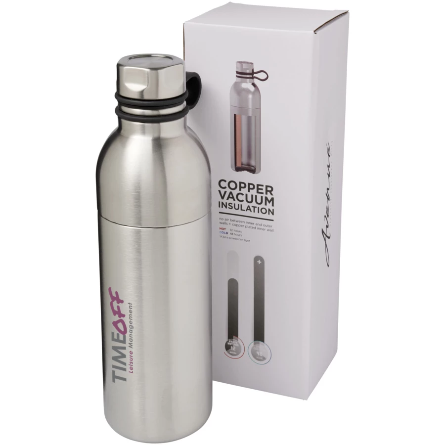 Dwuwarstwowa próżniowa konstrukcja ze stali nierdzewnej i miedziana izolacja zapewniają utrzymanie niskiej temperatury napojów przez 48 godzin i wysokiej przez co najmniej 12 godzin. Konstrukcja zapobiega również kondensacji na zewnątrz butelki. Posiada zakręcaną pokrywę górną ze stali nierdzewnej z wygodną silikonową pętlą do przenoszenia. Otwierana z dwóch stron konstrukcja ułatwiająca czyszczenie i napełnianie. Pojemność 590ml. Zapakowany w pudełko upominkowe Avenue.