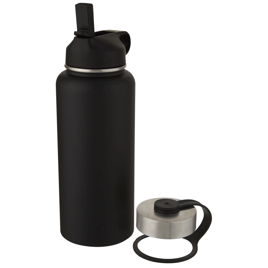 Bidon typu „dwa w jednym” z podwójnymi ściankami ze stali nierdzewnej i izolacją próżniową wykonaną z miedzi, wyposażony w 2 pokrywki: jedną pokrywkę ze słomką ułatwiającą picie i jedną szczelną, zakręcaną pokrywkę z pętelką do przenoszenia. Izolowana konstrukcja ze stali nierdzewnej 18/8 zapobiega skraplaniu się wody na zewnątrz butelki, a modne wykończenie z farby proszkowej sprawia, że jest ona wyjątkowo trwała. Szeroki otwór do łatwego napełniania, nalewania i czyszczenia. Wolna od BPA, przetestowana i zatwierdzona zgodnie z niemiecką ustawą o bezpieczeństwie żywności (LFGB). Sprawdzona i zatwierdzona pod kątem zawartości ftalanów zgodnie z przepisami REACH. Idealny do kostek lodu. Pojemność wynosi 1 litra. Zaleca się mycie ręczne. Zapakowany w kartonowe pudełko upominkowe wykonane z materiałów pochodzących z recyklingu.