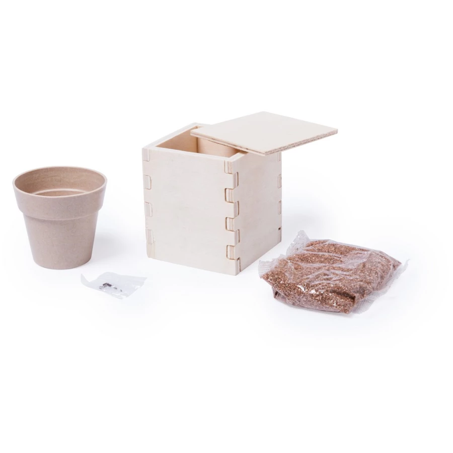 Drewniana osłonka na doniczkę, 6-8 nasion mięty, ziemia oraz doniczka w komplecie
