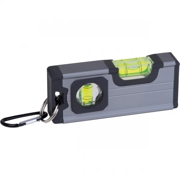 Mini poziomnica wykonana z aluminium z aplikacjami z plastiku ABS, dwiema libellami, magnesem na spodzie i karabińczykiem.