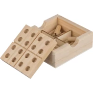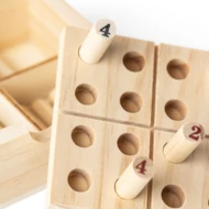 Mini zestaw sudoku, zestaw zawiera odczepianą planszę do gry, wewnątrz znajduje się schowek na 16 pionków do gry, zapakowany pojedynczo w brązowe kartonowe pudełko, produkt wykonany z drewna sosnowego
