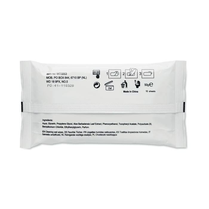 Mokre chusteczki czyszczące w etui. 10 szt. Rozmiar po rozłożeniu: 15x20cm. Ten produkt jest klasyfikowany jako kosmetyk.