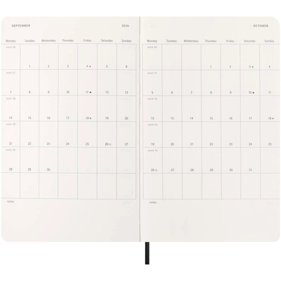 12-miesięczny kalendarz tygodniowy Moleskine w miękkiej oprawie, obejmujący okres od stycznia do grudnia 2026 r., pokazuje w skrócie cały tydzień, zawierając jednocześnie przeglądowe strony roczne i miesięczne zapewniające lepszy podgląd roku oraz strony na planowanie podróży, zapisywanie pomysłów i celów. Dni każdego tygodnia są pokazane po jednej stronie obok strony w linie z miejscem na zadania i notatki. Zawiera bezkwasowy papier w kolorze kości słoniowej, czarne elastyczne zamknięcie, wstążkę do zaznaczania stron, kolorową rozszerzalną kieszeń wewnętrzną i naklejki do personalizacji, a także naklejki z rokiem na grzbiecie.