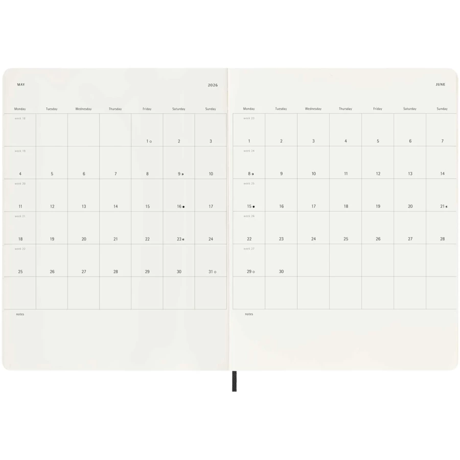 12-miesięczny kalendarz tygodniowy Moleskine XL w miękkiej oprawie, obejmujący okres od stycznia do grudnia 2026 r., pokazuje w skrócie cały tydzień, zawierając jednocześnie przeglądowe strony roczne i miesięczne zapewniające lepszy podgląd roku oraz strony na planowanie podróży, zapisywanie pomysłów i celów. Dni każdego tygodnia są pokazane po jednej stronie obok strony w linie z miejscem na zadania i notatki. Zawiera bezkwasowy papier w kolorze kości słoniowej, czarne elastyczne zamknięcie, wstążkę do zaznaczania stron, kolorową rozszerzalną kieszeń wewnętrzną i naklejki do personalizacji, a także naklejki z rokiem na grzbiecie.