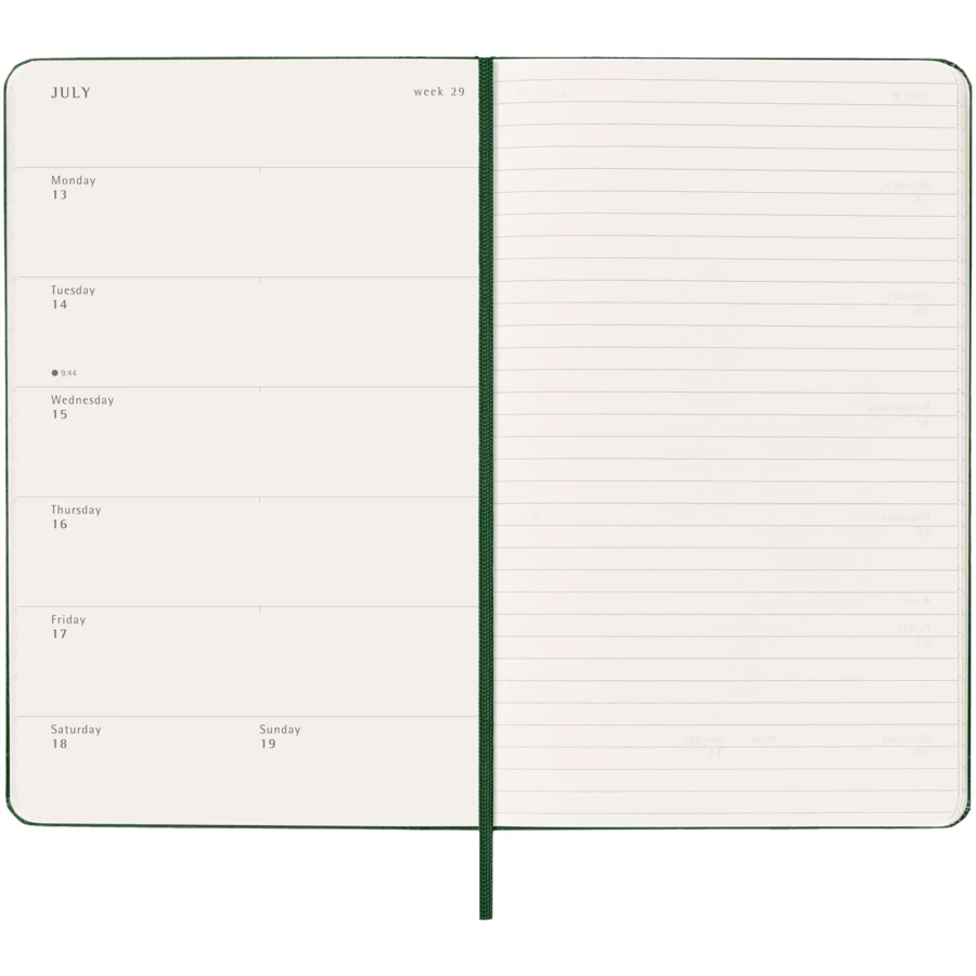 12-miesięczny kalendarz tygodniowy Moleskine w twardej oprawie, obejmujący okres od stycznia do grudnia 2026 r., pokazuje w skrócie cały tydzień, jak również zawiera roczne i miesięczne strony przeglądowe oferujące lepszy podgląd roku oraz strony na planowanie podróży, zapisywanie pomysłów i celów. Dni każdego tygodnia są pokazane po jednej stronie obok strony w linie z miejscem na zadania i notatki. Zawiera bezkwasowy papier w kolorze kości słoniowej, czarne elastyczne zamknięcie, wstążkę do zaznaczania stron, kolorową rozszerzalną kieszeń wewnętrzną i naklejki do personalizacji, a także naklejki z rokiem na grzbiecie.