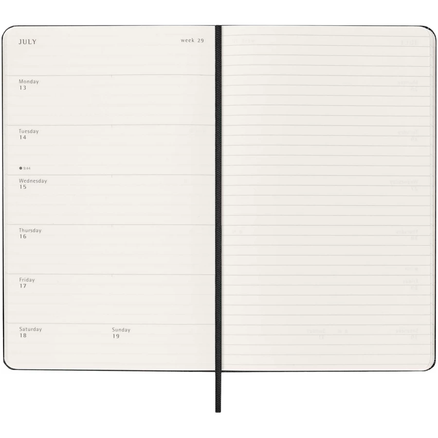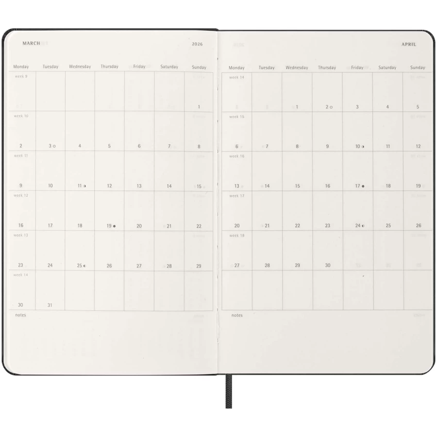 12-miesięczny kalendarz tygodniowy Moleskine w twardej oprawie, obejmujący okres od stycznia do grudnia 2026 r., pokazuje w skrócie cały tydzień, jak również zawiera roczne i miesięczne strony przeglądowe oferujące lepszy podgląd roku oraz strony na planowanie podróży, zapisywanie pomysłów i celów. Dni każdego tygodnia są pokazane po jednej stronie obok strony w linie z miejscem na zadania i notatki. Zawiera bezkwasowy papier w kolorze kości słoniowej, czarne elastyczne zamknięcie, wstążkę do zaznaczania stron, kolorową rozszerzalną kieszeń wewnętrzną i naklejki do personalizacji, a także naklejki z rokiem na grzbiecie.