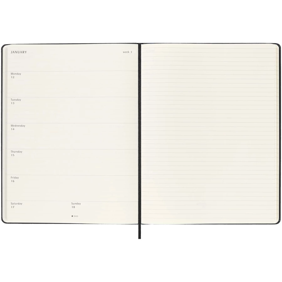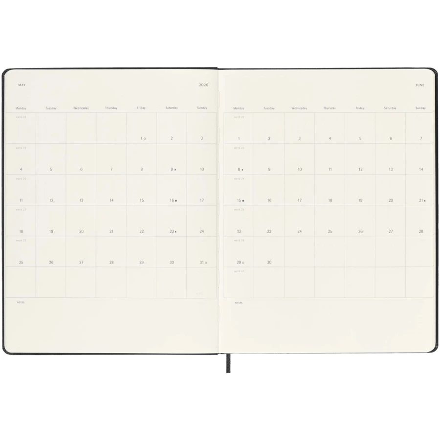 12-miesięczny kalendarz tygodniowy Moleskine XL w twardej oprawie obejmujący okres od stycznia do grudnia 2026 r. pokazuje w skrócie cały tydzień, jednocześnie udostępniając strony z rocznymi i miesięcznymi migawkami, jak również zawiera roczne i miesięczne strony przeglądowe oferujące lepszy podgląd roku oraz strony na planowanie podróży, zapisywanie pomysłów i celów. Dni każdego tygodnia są pokazane po jednej stronie obok strony w linie z miejscem na zadania i notatki. Zawiera bezkwasowy papier w kolorze kości słoniowej, czarne elastyczne zamknięcie, wstążkę do zaznaczania stron, kolorową rozszerzalną kieszeń wewnętrzną i naklejki do personalizacji, a także naklejki z rokiem na grzbiecie.