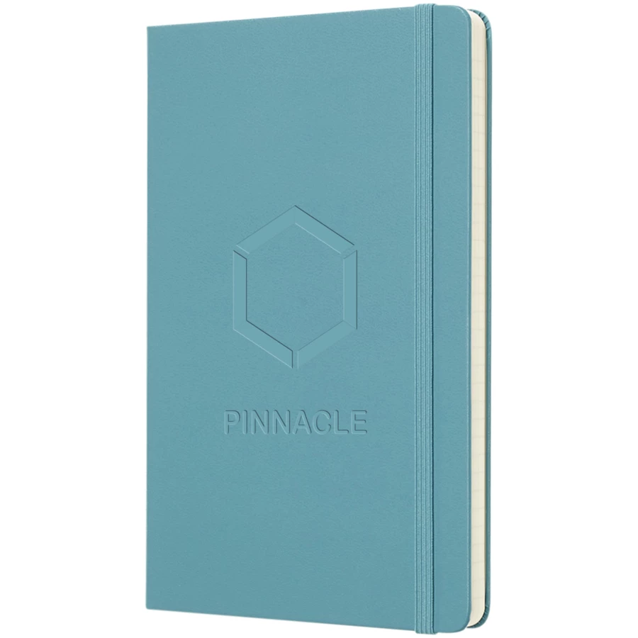 The Moleskine Classic large (13x21cm) hard cover notebook features a cardboard bound cover with rounded corners, acid free paper, a ribbon bookmark and elastic closure. On the first page in case of loss notice with space to jot down a reward for the finder. Attached to the back cover an expandable inner pocket that contains the Moleskine history. The pocket can be used for loose papers and notes. Contains 240 ivory-coloured ruled pages. Available in a wide range of stylish vibrant colours.
