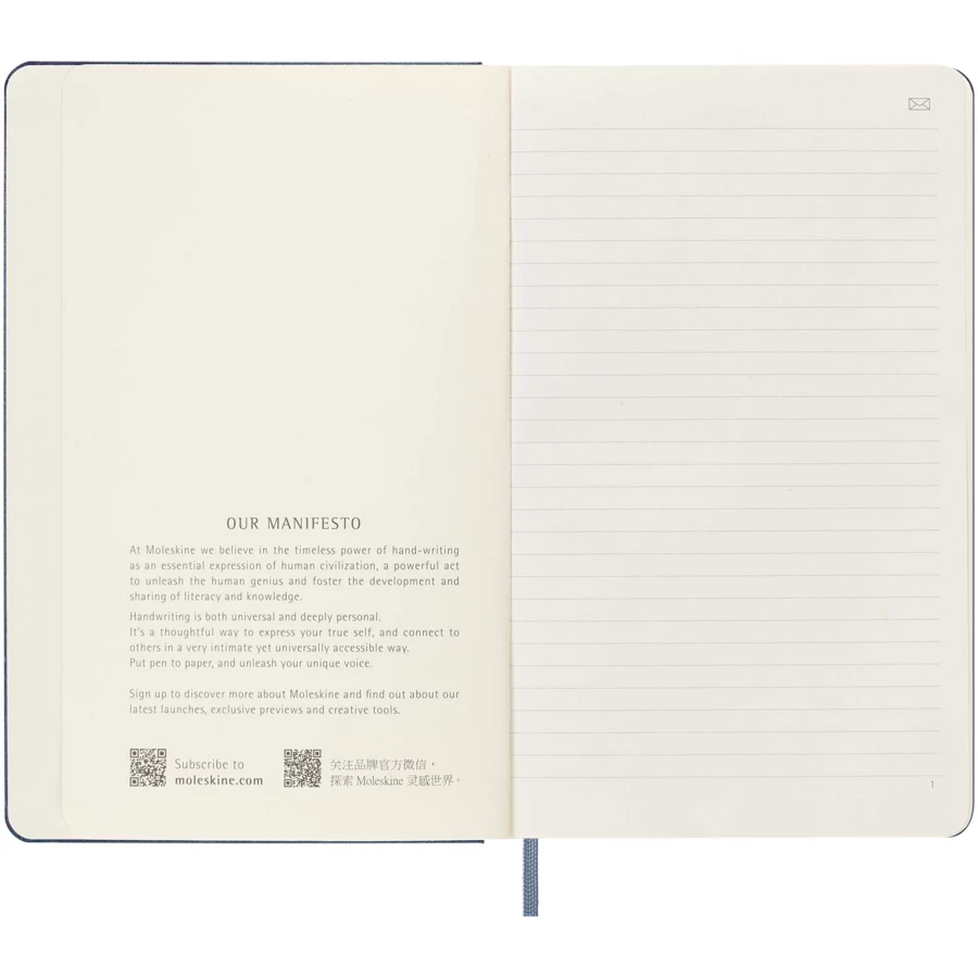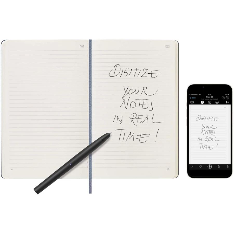 Duży, inteligentny notatnik Moleskine ma klasyczną twardą okładkę z zaokrąglonymi rogami i papier w kolorze kości słoniowej. Każda strona zawiera niewidoczne kody N, które umożliwiają Smart Pen natychmiastowe utworzenie cyfrowej kopii każdego słowa i szkicu w aplikacji Moleskine Notes. Notatnik zawiera także historię Moleskine.