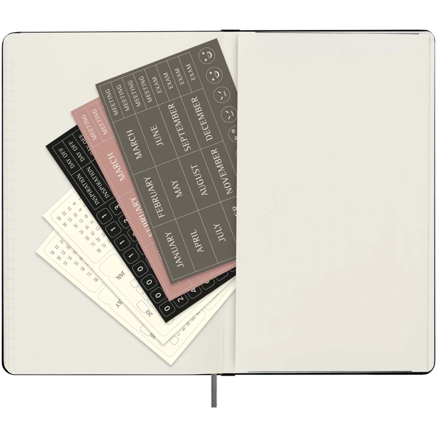 Moleskine planer tygodniowy bez dat, który można zacząć używać w dowolnym momencie w ciągu roku. Jest to doskonały wybór dla osób poszukujących elastycznego i trwałego narzędzia do planowania. Pola na miesiąc, tydzień i datę pozostają puste, co zapewnia większą elastyczność i swobodę niż w przypadku planera z datami. Wpisując daty samodzielnie, można pominąć wszelkie luki i korzystać tylko z potrzebnych stron. Posiada 12 konfigurowalnych przekładek na miesiące, pięć niedatowanych tygodni na miesiąc, elastyczne zamknięcie i dopasowaną zakładkę ze wstążki, bezkwasowy papier o gramaturze 70 g/m2 w kolorze kości słoniowej oraz rozszerzaną kieszeń wewnętrzną.