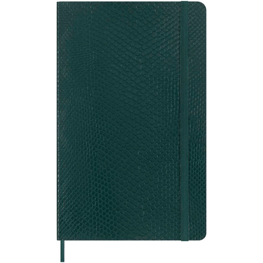 Duży notatnik Vegea Boa ma miękką okładkę z motywem wegańskiego pytona, zaokrąglone rogi, elastyczne zamknięcie i pasującą zakładkę ze wstążki. Notatniki zawierają bezkwasowy papier w kolorze kości słoniowej i rozszerzalną kieszeń wewnętrzną z historią Moleskine. Sprzedawany w ozdobnym pudełku upominkowym.