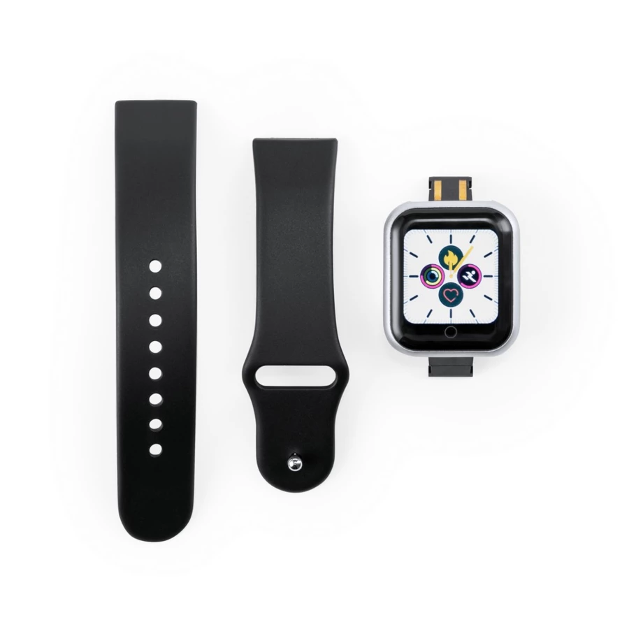 Monitor aktywności, bezprzewodowy zegarek wielofunkcyjny, BT 4.0, dotykowy wyświetlacz LCD 1.44", bateria 50 mAh 3.7V, zasięg do 10 m, kompatybilny z iOS 9.0 (lub nowsze) lub Android 5.0 (lub nowsze), ładowany przez USB, funkcje: monitor pracy serca, monitor ciśnienia krwi, monitor natlenowania krwi, licznik spalonych kalorii, krokomierz, monitor snu, powiadomienia z aplikacji, powiadomienia o wiadomościach i połączeniach, wyzwalacz migawki, alarm, wibracje, czas i data, zabezpieczenie przed zgubieniem