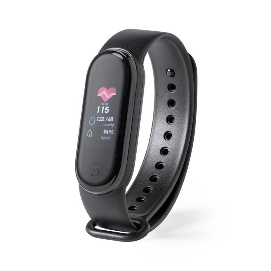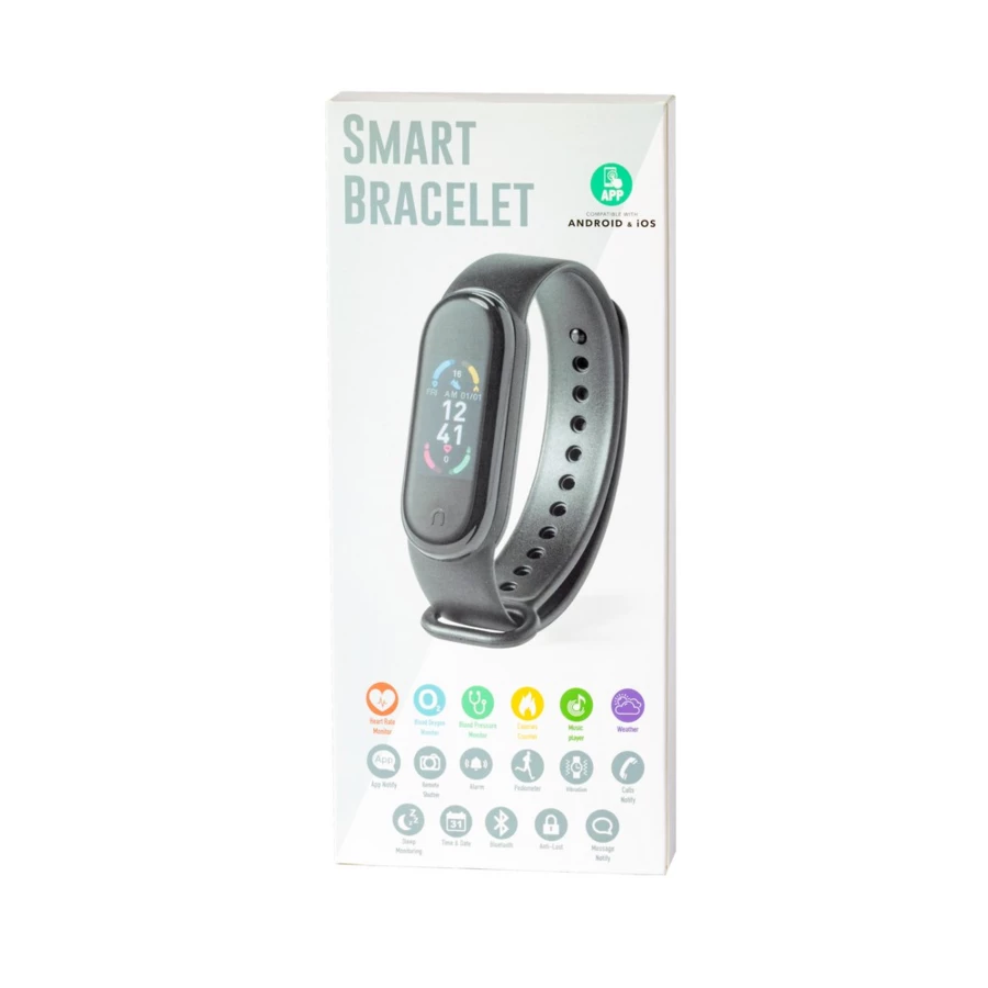 Monitor aktywności, bezprzewodowy zegarek wielofunkcyjny BT 4.0, dotykowy wyświetlacz TFT 0.96", bateria 90 mAh, ładowany przez USB, kabel w komplecie, funkcje: temperatura, monitor pracy serca, monitor ciśnienia krwi, monitor natlenowania krwi, licznik spalonych kalorii, funkcja połączeń BT, krokomierz, monitor snu, powiadomienia o połączeniach i wiadomościach, powiadomienia z aplikacji, wyzwalacz migawki, alarm, wibracje, czas i data, zabezpieczenie przed zgubieniem, odtwarzacz muzyki, pogoda