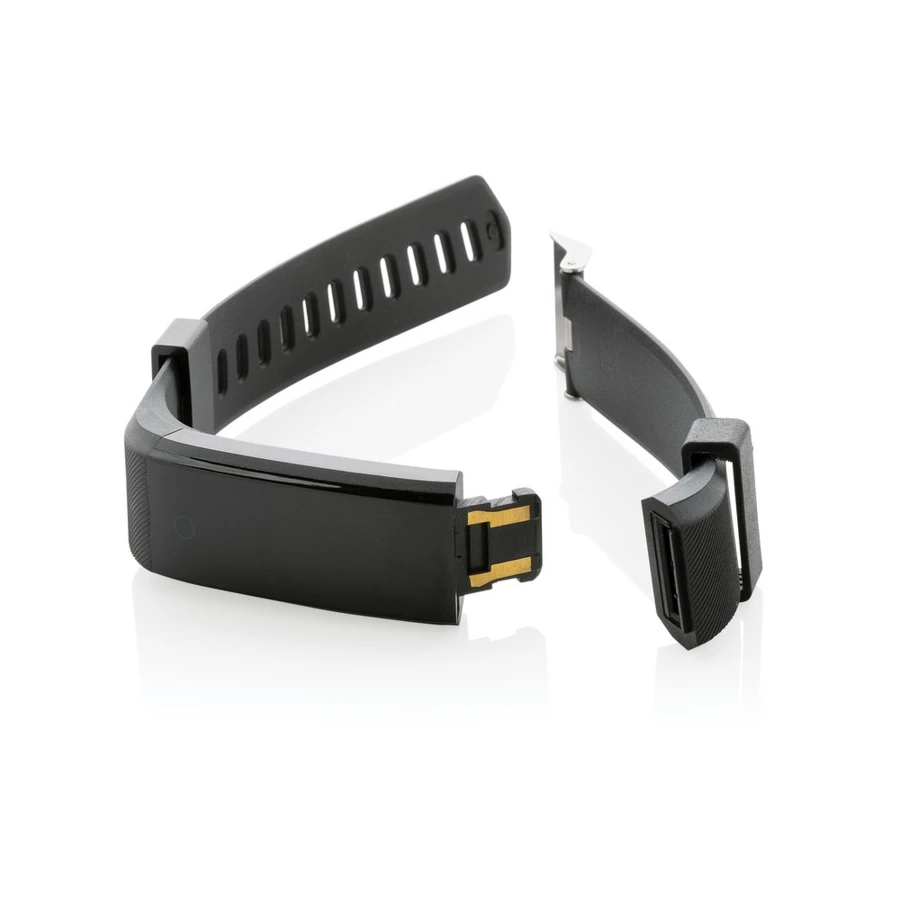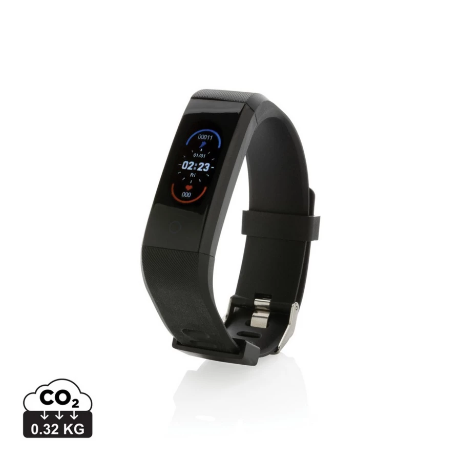Monitor aktywności Fit Watch 0,96",BT 5.0, wykonany z ABS z recyklingu, pasek wykonany z TPE z recyklingu, posiada certyfikat RCS (Recycled Claim Standard), całkowita zawartość materiału z recyklingu obliczona w oparciu o wagę całkowitą przedmiotu: 35%, funkcje licznika kroków, śledzenia tętna, mierzenia ciśnienia oraz tlenu we krwi, pomiar czasu snu, pomiar spalonych kalorii, pomiar pokonanej odległości, wodoodporność IPX5 całkowita ochrona przed strumieniem wody płynącej z różnych kierunków z wydajnością do 12,5 litra na minutę, kompatybilny z Androidem 4.4 oraz IOS 8.0 lub nowszymi, czas czuwania do 15 dni, czas pracy do 7 dni, w pudełku kraftowym z certyfikatem FSC® mix, nie zawiera PVC, ślad węglowy produktu: 0,32 kg CO2