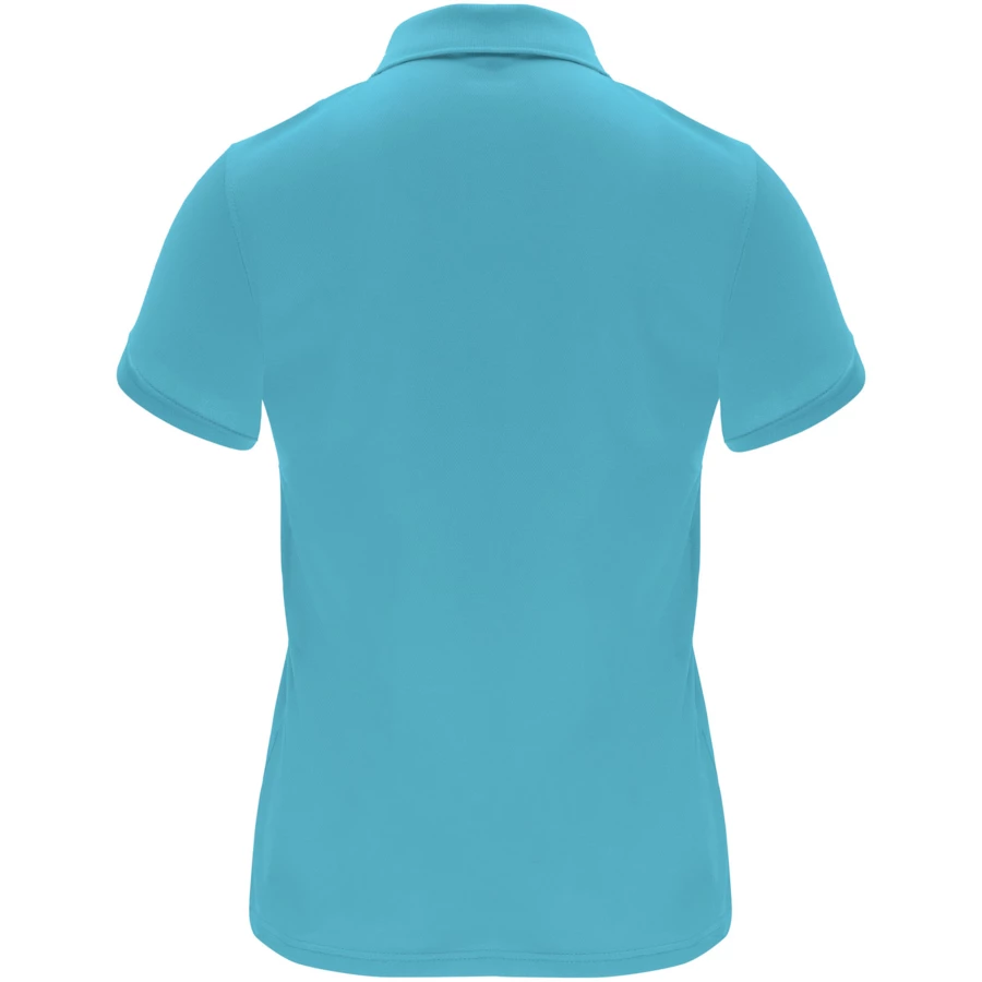 Techniczna koszulka polo z krótkim rękawem dla kobiet. Dzianinowy kołnierzyk z zapięciem na trzy guziki. Dopasowany krój. Oddychająca, łatwa do prania i suszenia tkanina. Usuwalna metka. Tkanina techniczna. Oddychająca tkanina.