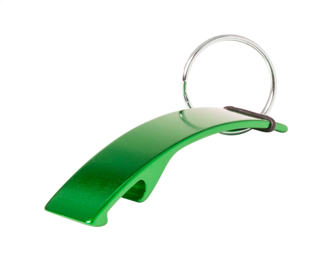 Aluminiowy otwieracz do butelek z brelokiem.