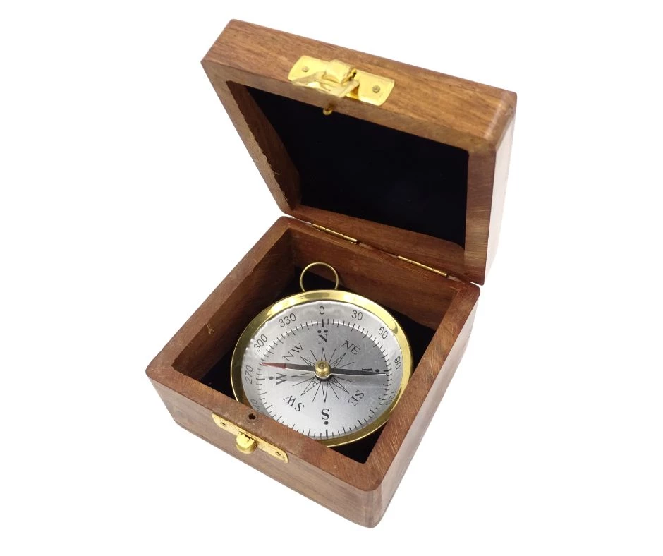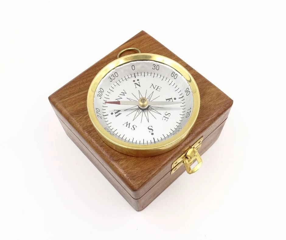 Mosiężny kompas w drewnianym pudełku - C35A