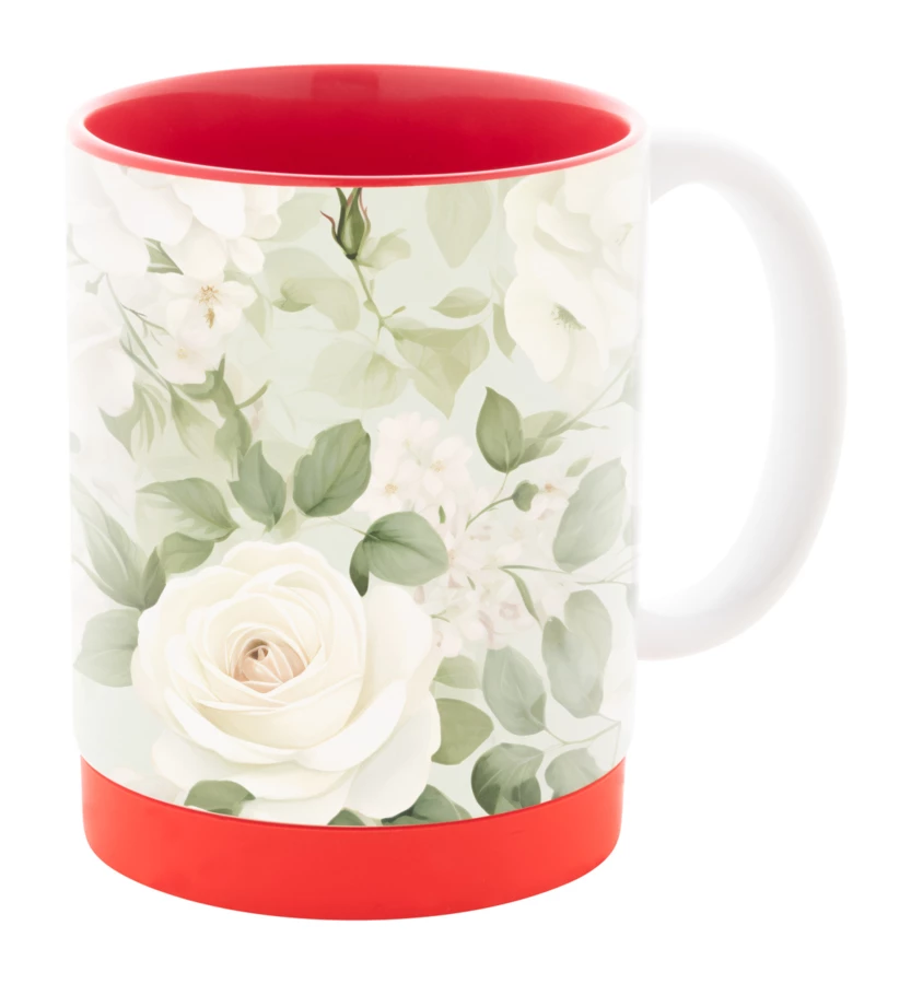 Kubek ceramiczny do sublimacji z kolorowym wnętrzem i dopasowanym kolorystycznie silikonowym pierścieniem na spodzie. Pojemność 300 ml. W białym kartoniku.