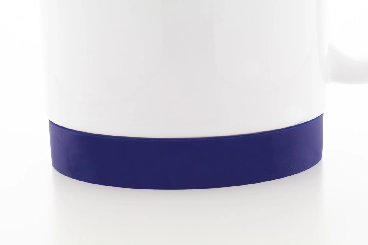 Kubek ceramiczny do sublimacji z kolorowym wnętrzem i dopasowanym kolorystycznie silikonowym pierścieniem na spodzie. Pojemność 300 ml. W białym kartoniku.