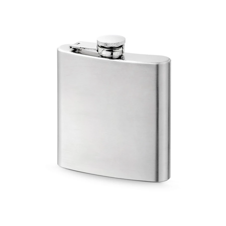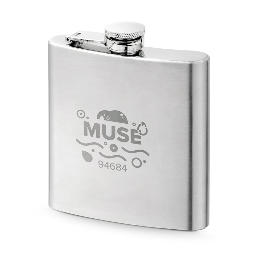 Butelka kieszonkowa ze stali nierdzewnej o pojemności do 180 mL. Dostarczany w pudełku. 100 x 110 x 25 mm