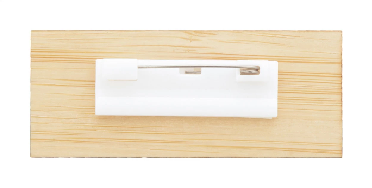 Bambusowa plakietka z agrafką na imię i nazwisko.