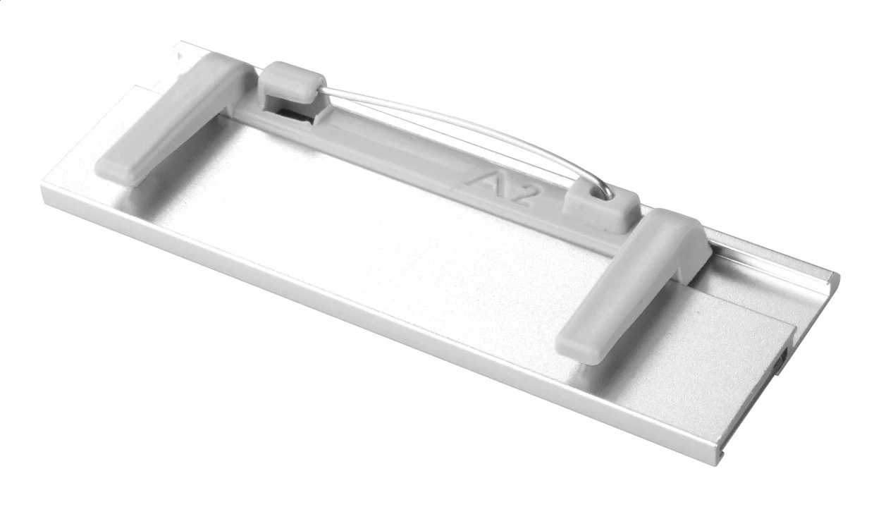 Aluminiowa przywieszka z wymiennymi papierowymi i plastikowymi elementami.