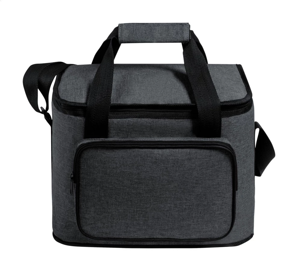 Torba termoizolacyjna RPET z wyściółką PEVA, przegródkami na suwak, uchwytami na rzep i regulowanym paskiem na ramię. Z metką RPET. Poliester 600D RPET.