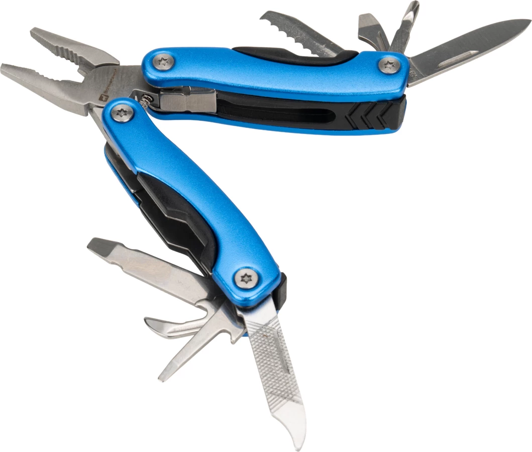 Multitool posiada 13 narzędzi, m.in.: kombinerki, pilnik, śrubokręt płaski i Philips, nóż, piłka, otwieracz do butelek i konserw. Narzędzie zapakowane w neoprenowy pokrowiec.
