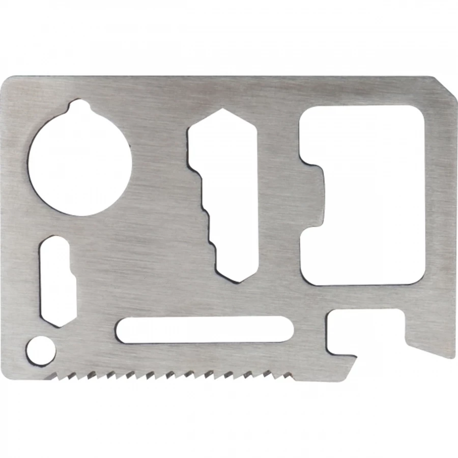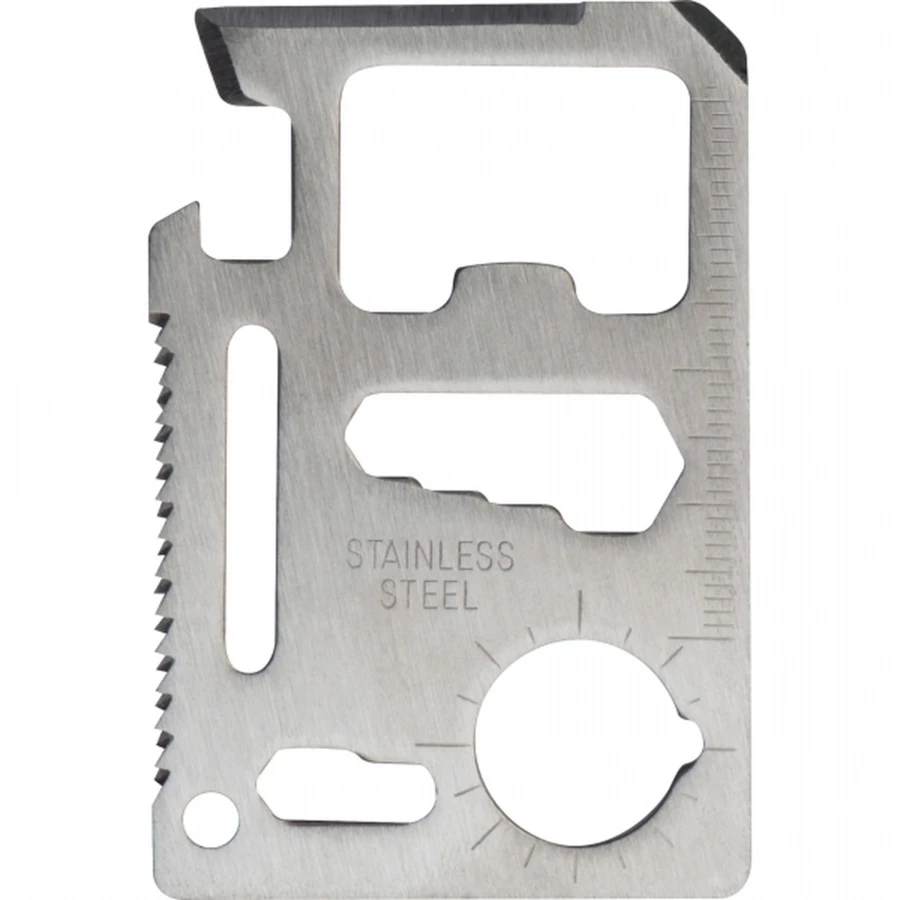 Multinarzędzie 15 w 1, wykonane ze stali nierdzewnej. Funkcje: otwieracz do puszek, nóż, śrubookręt, otwieracz do butelek, linijka, 4 klucze sześciokątne (6/7/8/10mm), kątomierz, 2 klucze sześciokątne (4/5mm), piła, klucz motylkowy.