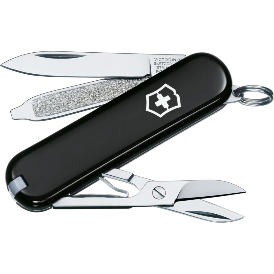 Narzędzie wielofunkcyjne Victorinox Classic SD z 7 funkcjami: wykałaczką, nożyczkami, pęsetą, pilnikiem do paznokci, śrubokrętem (2,5 mm), brelokiem do kluczy i małym ostrzem, zapakowane w pudełko upominkowe, produkt wykonany z ABS i metalu