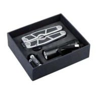 Zestaw składający się z 11-funkcyjnego multitoola i 9-diodowej latarki w opakowaniu upominkowym. Ostrza wykonane ze stali nierdzewnej. Multitool posiada antypoślizgowe okładziny z tworzywa ABS. Zawiera: szczypce uniwersalne, okładziny antypoślizgowe, szydło, wkrętaki płaskie, otwieracz do butelek, nóż, skrobak do ryb z końcówką do haczyków wędkarskich, pilnik, piłę, wkrętak PH krzyżowy, otwieracz do konserw. Do zestawu dołączone są baterie – 3 x AAA.