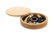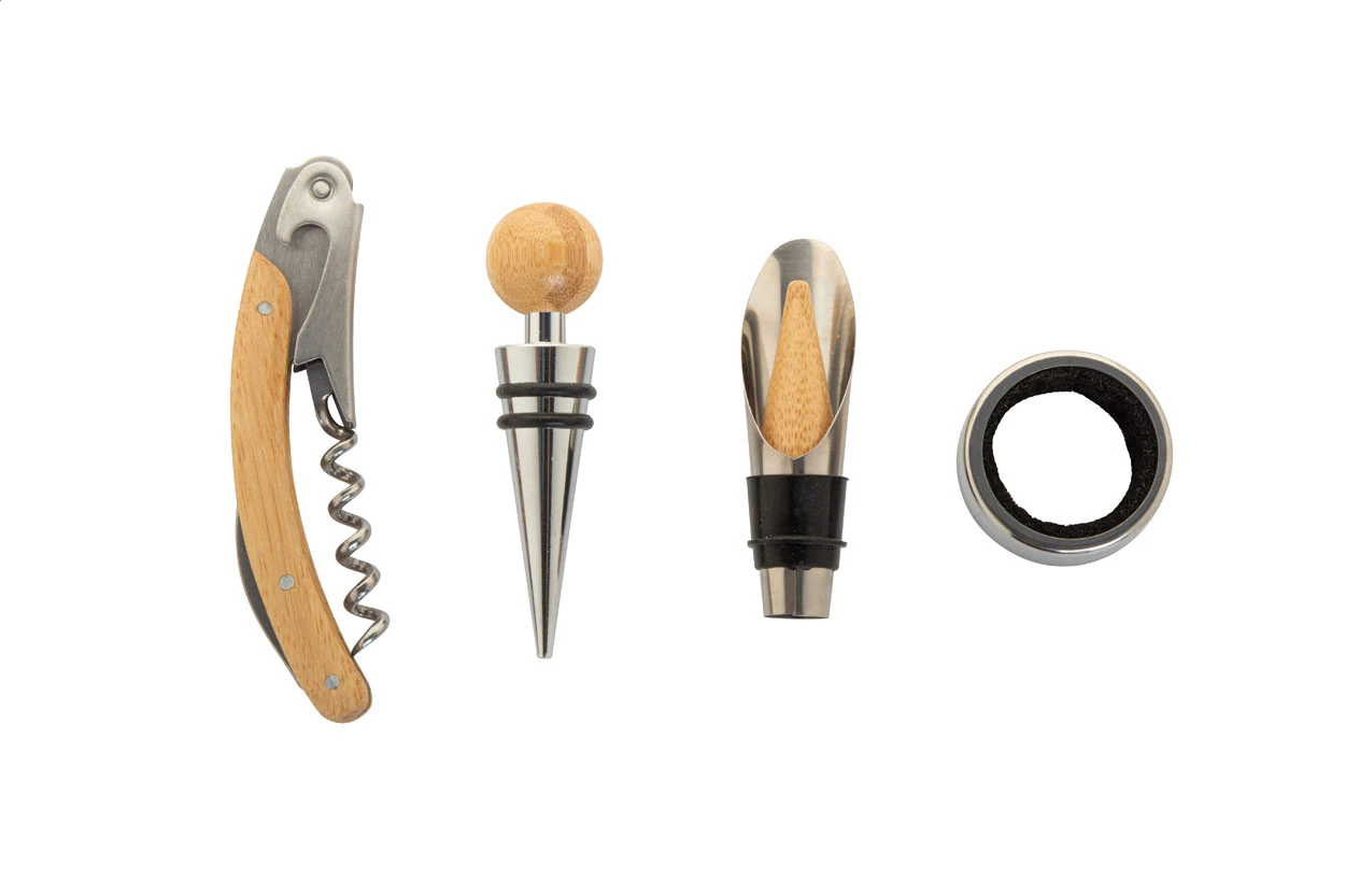 4-elementowy bambusowy zestaw do wina ze stali nierdzewnej w okrągłym bambusowym pudełku. Zawiera korkociąg, ociekacz, lejek i zatyczkę.