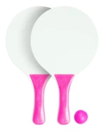 2 rakietki do tenisa plażowego z piłką, wykonane z drewna i plastiku.