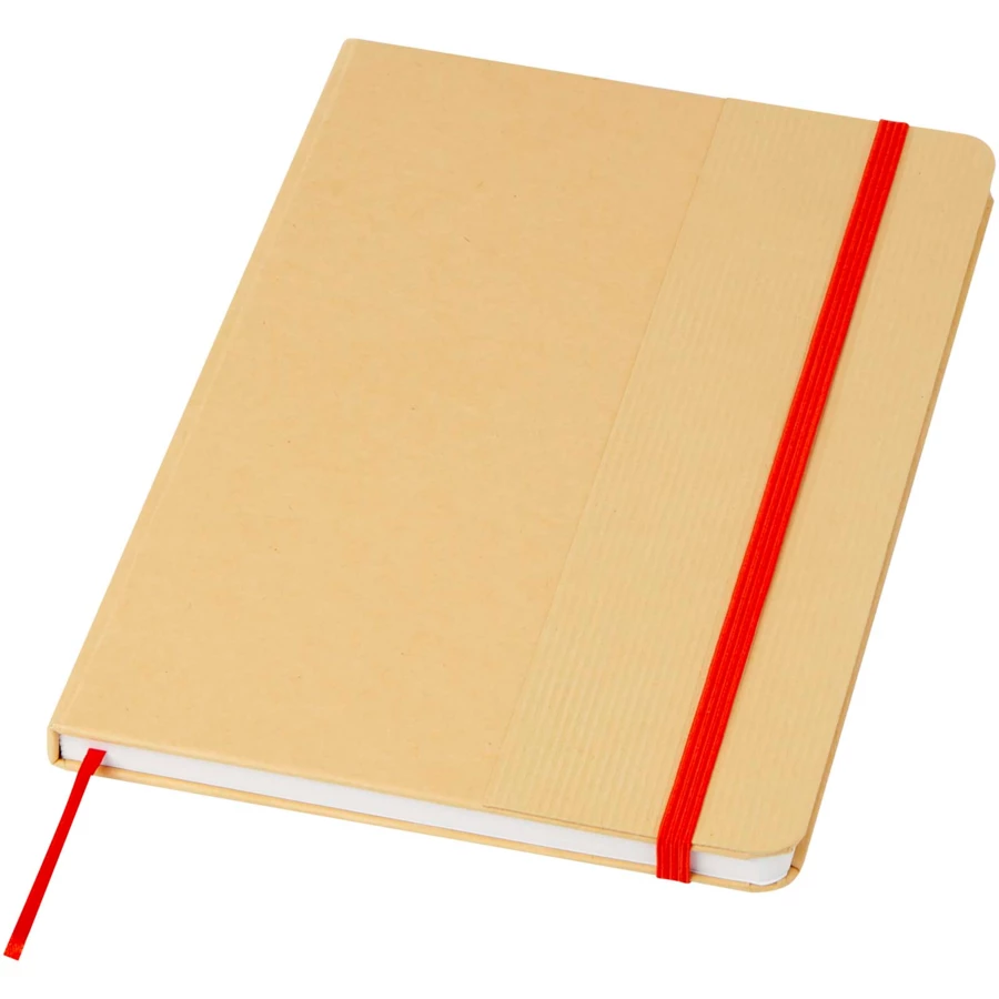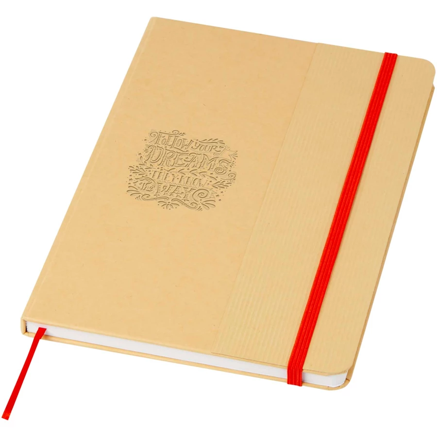 Notatnik A5 w twardej oprawie, wykonany z kartonu pochodzącego z recyklingu, zawierający 80 kartek w linie o gramaturze papieru 70 g/m². Notatnik posiada elastyczne zamknięcie, wstążkę i zaokrąglone rogi.