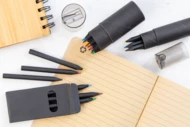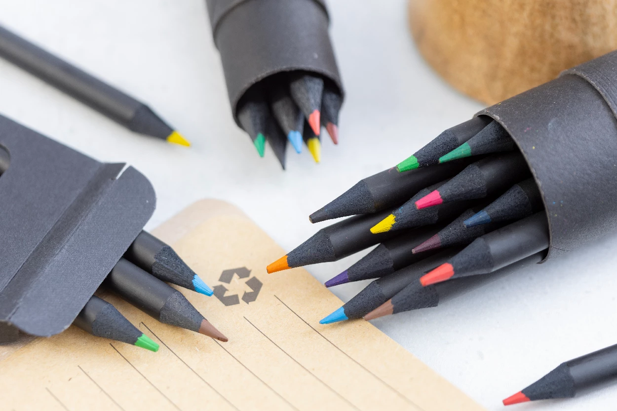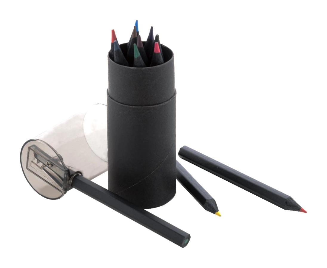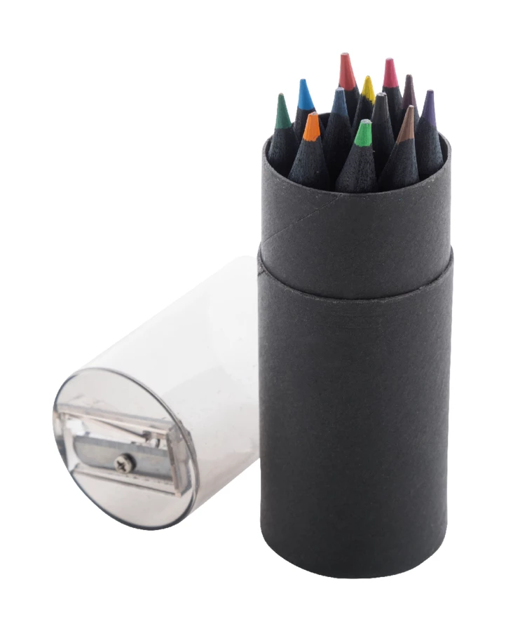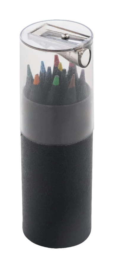 Zestaw 12 czarnych kredek z drewna w okrągłym, czarnym opakowaniu z tektury, z plastikową temperówką.