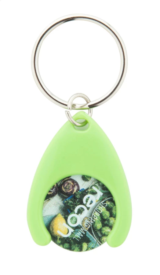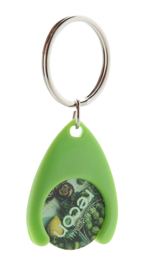 Plastikowy brelok z miejscem na monetę. Wielkość monety: ø24×2 mm.