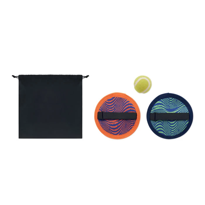 Neoprenowa gra w łapanie piłek. Zawiera 1 piłkę, parę łapaczy w torbie z siatki RPET ze sznurkiem.
