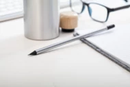 Ołówek z czarnego drewna w metalicznym wykończeniem, z czarną gumką. Zatemperowany, klasa HB.